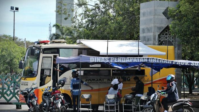 Pemilik kendaraan bermotor melakukan pembayaran pajak perpanjangan Surat Tanda Nomor Kendaraan (STNK) di mobil Pelayanan Samsat Keliling Pemerintah Provinsi Sulawesi Selatan di Jalan Sunu, Makassar, Rabu, (14/9). Samsat keliling ini beroperasi di jalan raya secara mobile atau berpindah-pindah untuk memudahkan wajib pajak untuk membayar pajak kendaraannya. tribun timur/muhammad abdiwan