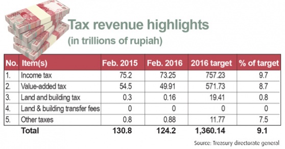 By February, tax revenues stood at Rp 124.2 trillion, representing just 9.1 percent of the full-year target of Rp 1.36 quadrillion. The figure is 5 percent lower than at the same point last year.