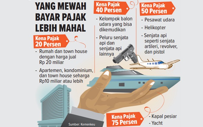 Kemudian, dalam pasal 3, disebutkan barang-barang yang terkena pajak barang mewah, yaitu kelompok pesawat udara dan helikopter. Pada kelompok tersebut, pengenaan pajaknya mencapai 50 persen. Pada pasal 4, barang-barang mewah yang dikenai pajak 75 persen adalah kapal pesiar dan yacht, kecuali yang digunakan untuk keperluan transportasi umum. (ken/c23/sof)