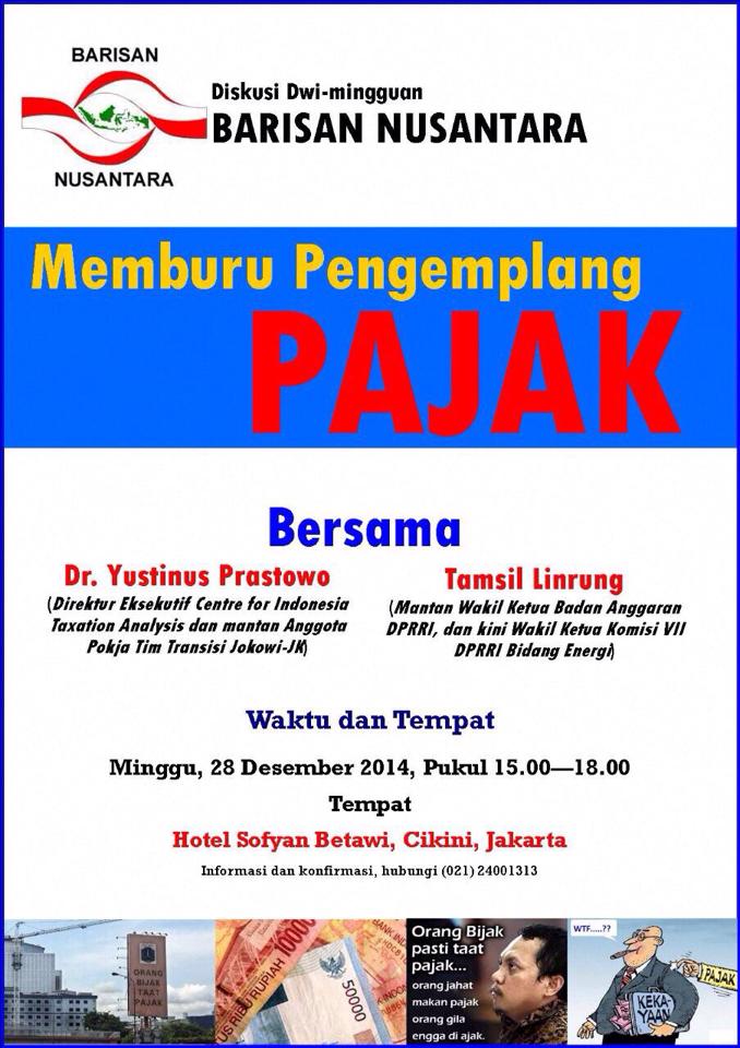 Post Views: 243 Konferensi Pers Tema : Seleksi Dirjen Pajak yang Transparan dan Berkualitas akan mengadakan konferensi pers menyikapi perkembangan seleksi dirjen pajak. Koalisi juga ingin mendorong Pansel agar melakukan seleksi yang transparan, objektif, dan memperhatikan kepentingan publik. Waktu : Kamis 11 Desember 2014, pukul 13.30 WIB. Tempat : Kantor ICW Jl Kalibata Timur IVD/6 Jaksel Narasumber : Koalisi […]