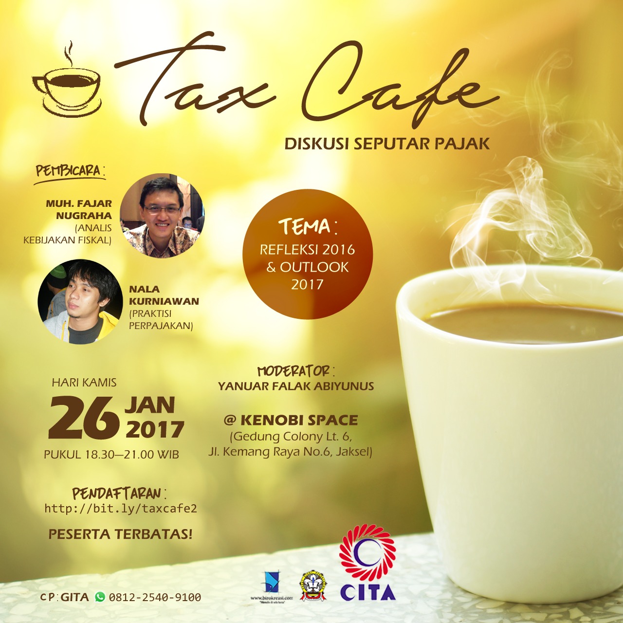 Post Views: 1.113 Memperingati Hari Pajak Nasional 14 Juli 2019, CITA bersama dengan IKA STIAMI dan PajakMania mempersembahkan kegiatan diskusi rutin Tax Café yang bertema “Gatal Pajak Digital?”, pada: 🗓 Hari/tanggal : Jumat, 26 Juli 2019 ⏰ Waktu : 14.00 s.d. 16.30 WIB 📍 Tempat : Kampus Pusat Institut Ilmu Sosial dan Manajemen STIAMI (Institut […]