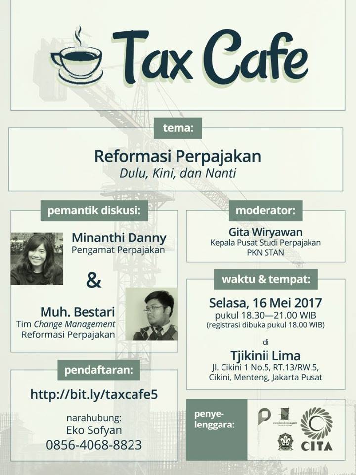 Post Views: 1.113 Memperingati Hari Pajak Nasional 14 Juli 2019, CITA bersama dengan IKA STIAMI dan PajakMania mempersembahkan kegiatan diskusi rutin Tax Café yang bertema “Gatal Pajak Digital?”, pada: 🗓 Hari/tanggal : Jumat, 26 Juli 2019 ⏰ Waktu : 14.00 s.d. 16.30 WIB 📍 Tempat : Kampus Pusat Institut Ilmu Sosial dan Manajemen STIAMI (Institut […]