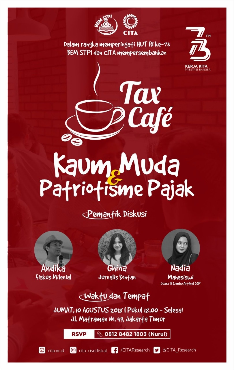 Post Views: 534 Center for Indonesia Taxation Analysis (CITA) mempersembahkan diskusi publik yang dikemas dalam acara CITAxTalk edisi Ramadhan bertema ”Menyegarkan Pemikiran Perpajakan Indonesia” TRAINER: – Dr. Joko Tri Haryanto (Peneliti Madya Badan Kebijakan Fiskal – Alumnus UI) Rabu, 8 Mei 2019 pukul 15.30 – 17.30 (dilanjutkan buka bersama) – Arifin Rosid, Ph.D (Direktorat Jenderal […]